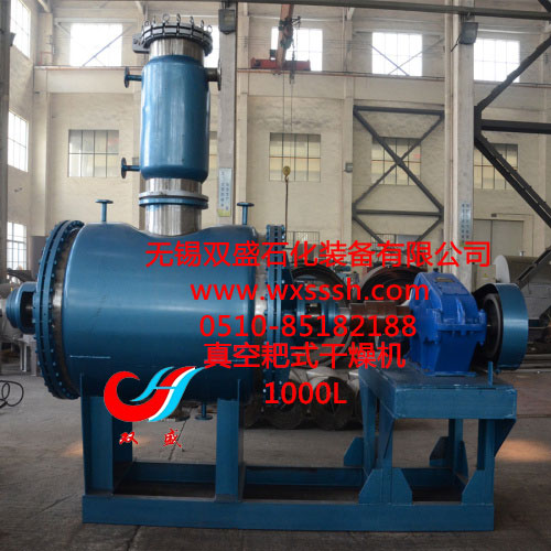 被干燥物料從殼體上方正中間加入,在不斷正反轉(zhuǎn)動(dòng)的耙齒的攪拌下,物料軸向來(lái)回走動(dòng),與殼體內(nèi)壁接觸的表面不斷更新,受到蒸汽的間接加熱,耙齒的均勻攪拌,粉碎棒的粉碎,使物料內(nèi)的水份氣化,在真空系統(tǒng)的作用下,使被干燥物料內(nèi)部水份和表面水份更有利的排出,氣化的水份經(jīng)干式除塵器、濕式除塵器、冷凝器,從真空泵出口處放空。